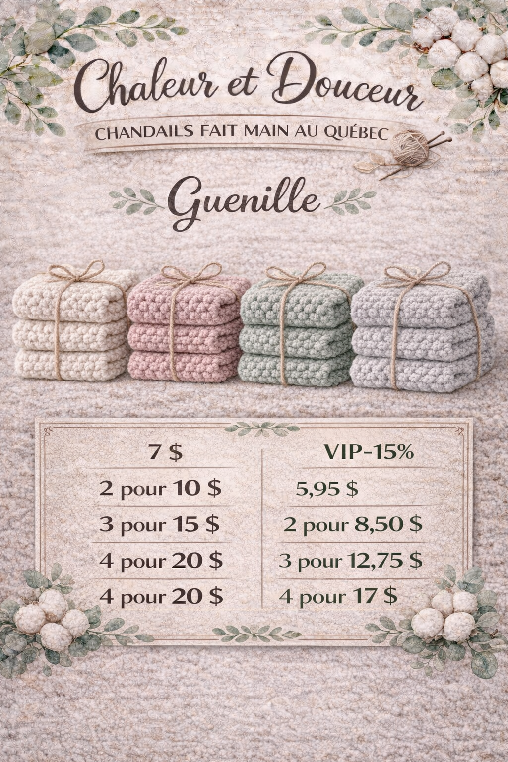 Nos guenilles réutilisables Chaleur et Douceur sont tricotées à la main au Québec avec soin et amour. Elles sont pensées pour être vraiment efficaces, tout en restant douces pour tes surfaces et belles dans ta cuisine.