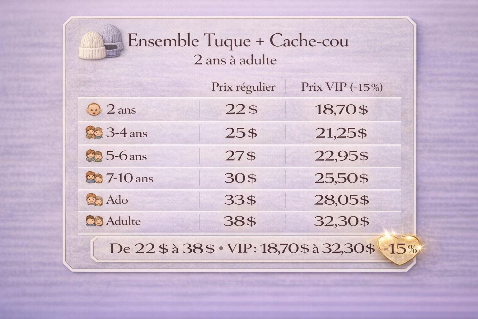 Chaque ensemble comprend une tuque et un cache-cou parfaitement assortis, conçus pour garder petits et grands bien au chaud tout l’hiver.