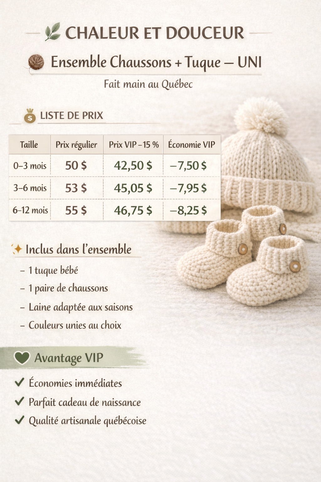 Pensé pour envelopper bébé de chaleur et de douceur, notre ensemble chaussons et tuque est entièrement fait à la main au Québec avec le plus grand soin.